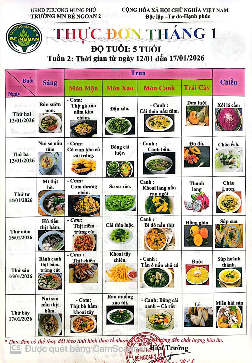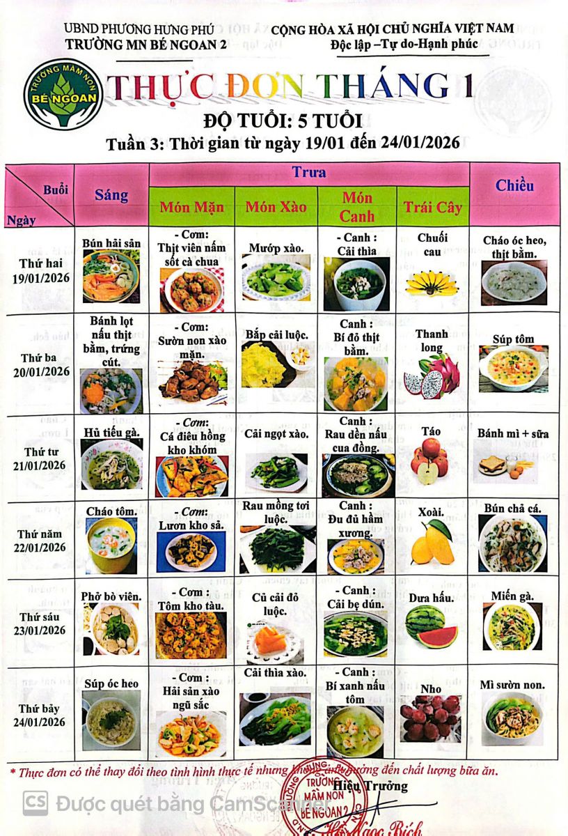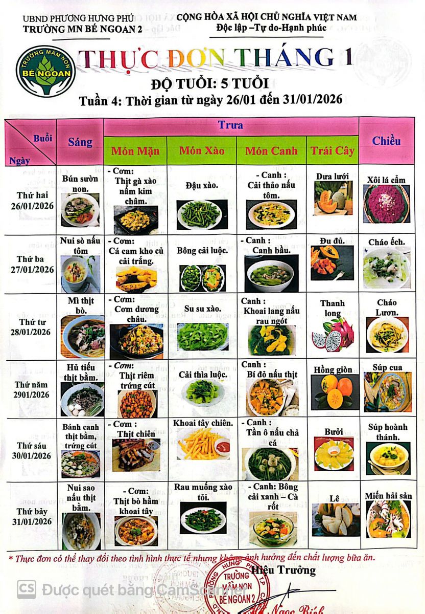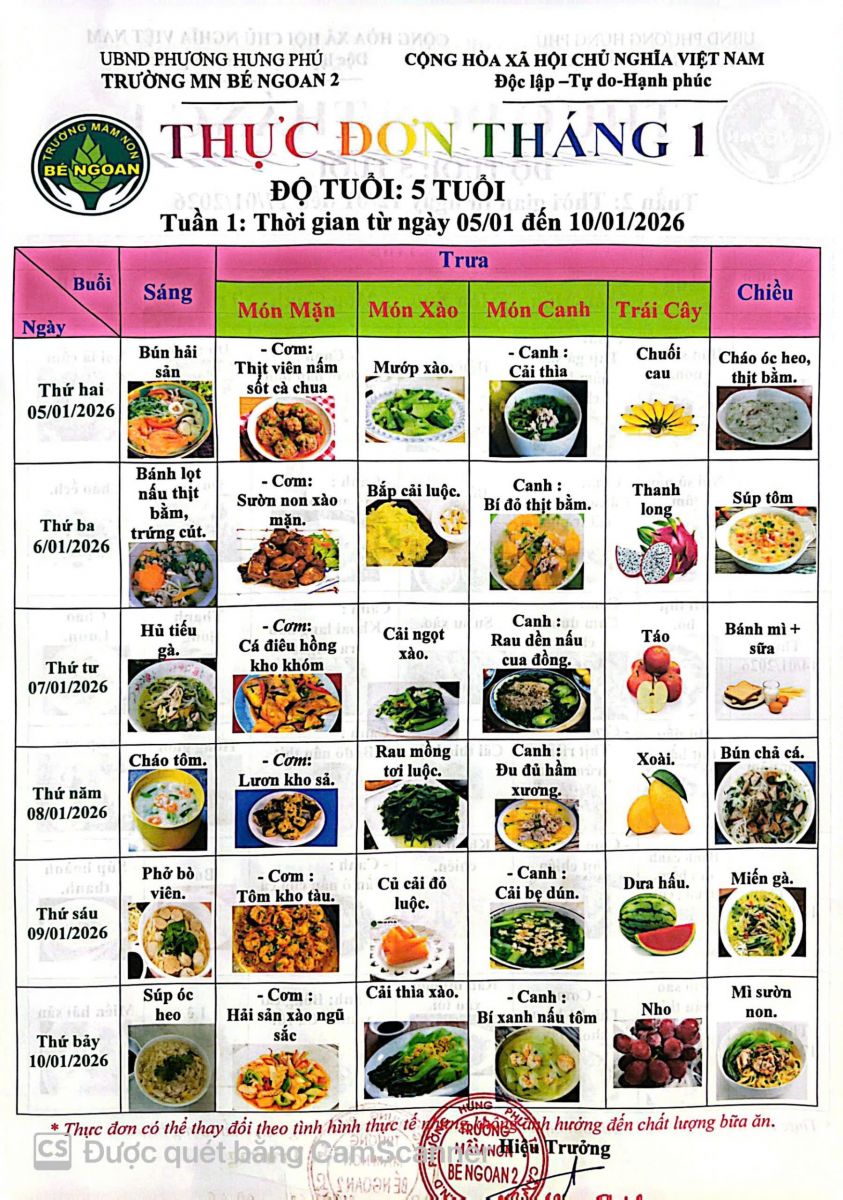 THỰC ĐƠN THÁNG 1 LỚP LÁ 5 TUỔI