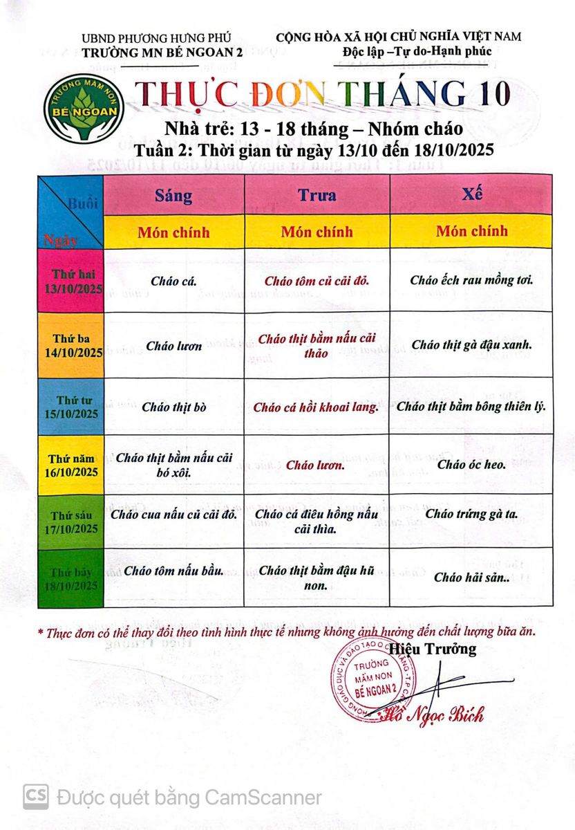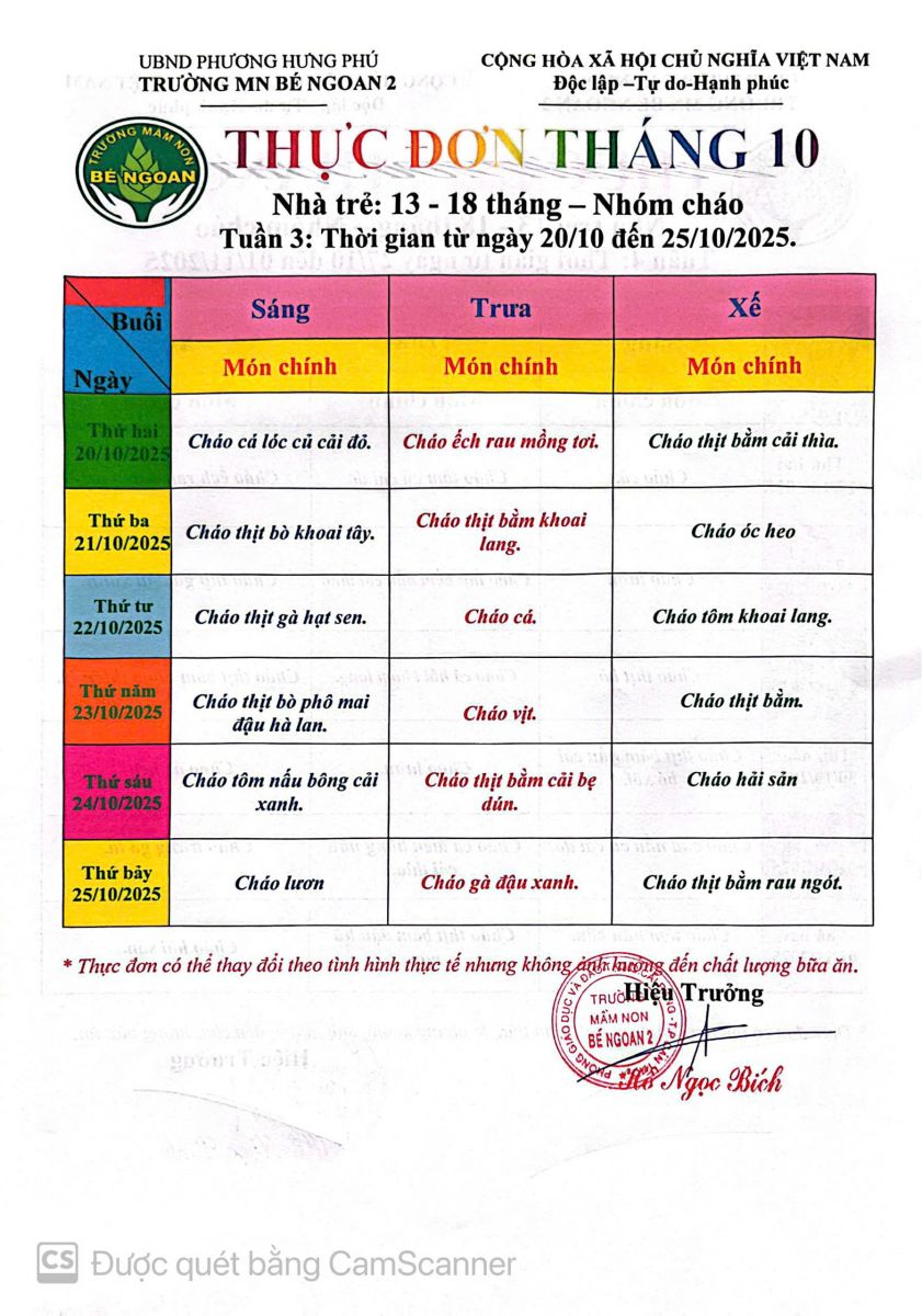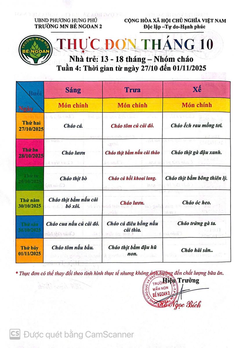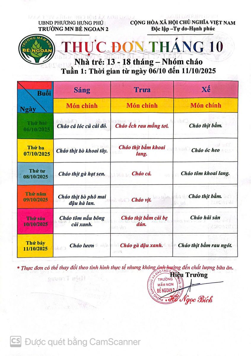 THỰC ĐƠN THÁNG 10 NT 13-18 THÁNG - Nhóm Cháo