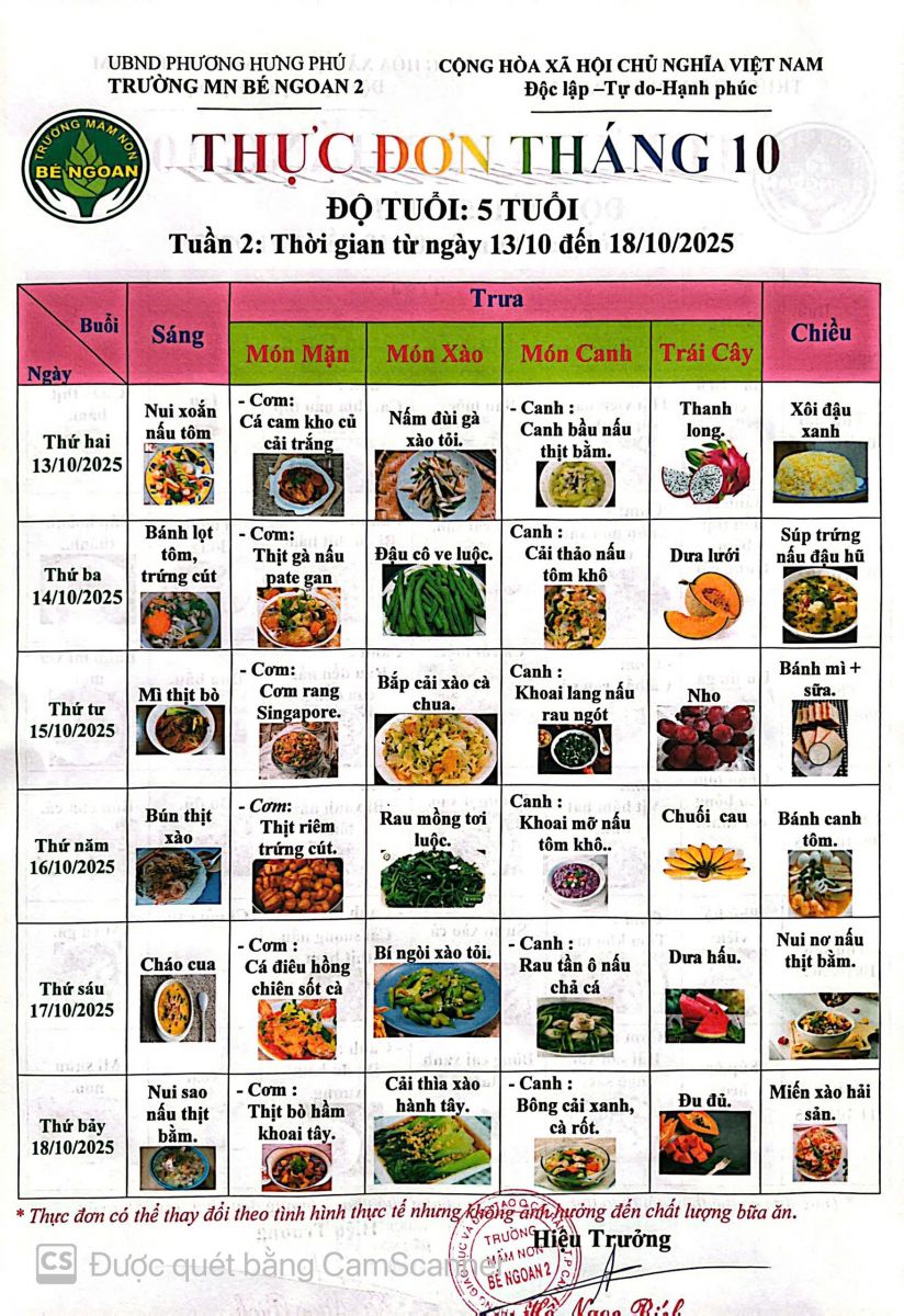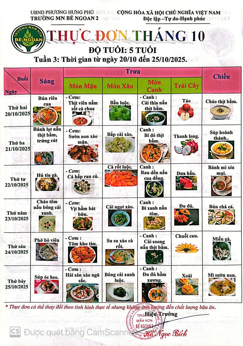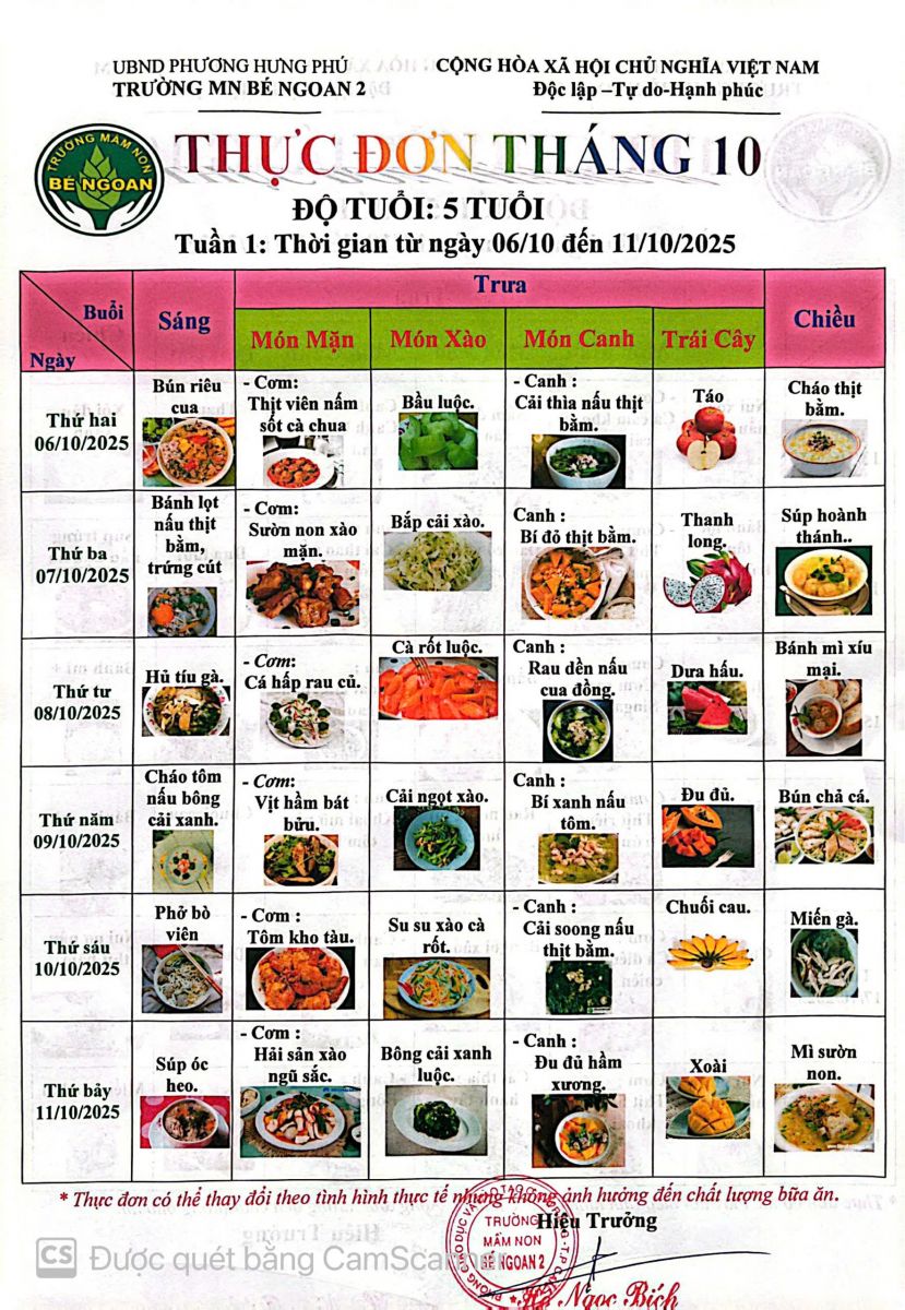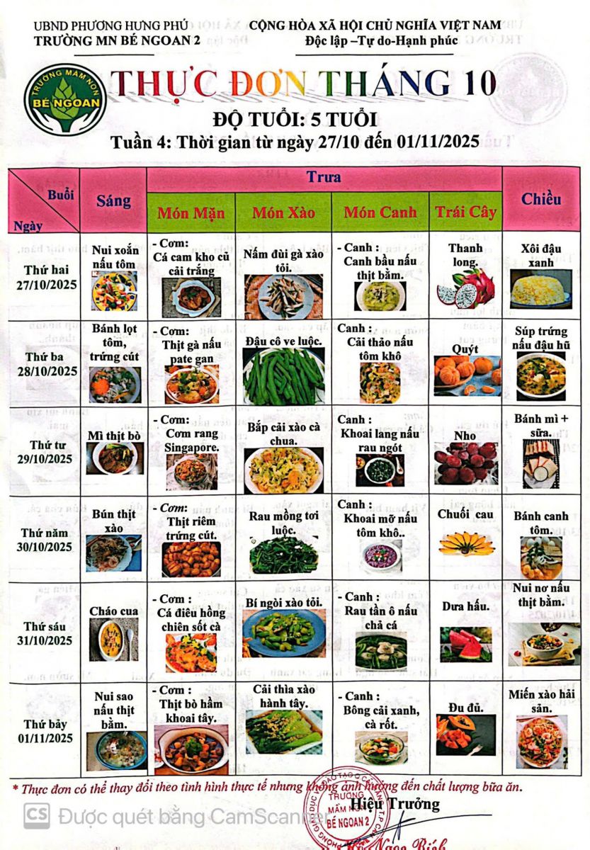 THỰC ĐƠN THÁNG 10 LỚP LÁ 5 TUỔI
