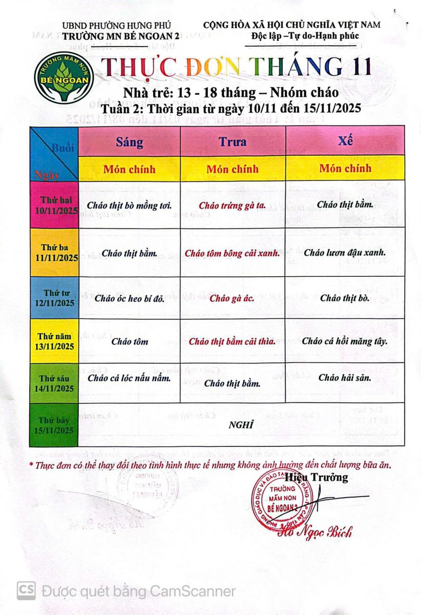 THỰC ĐƠN THÁNG 11 NT 13-18 THÁNG - Nhóm Cháo