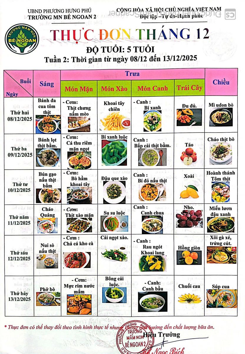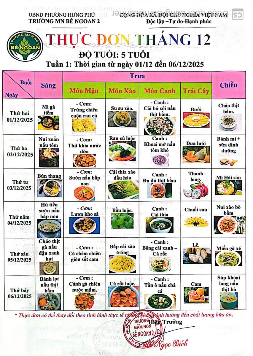 THỰC ĐƠN THÁNG 12 LỚP LÁ 5 TUỔI